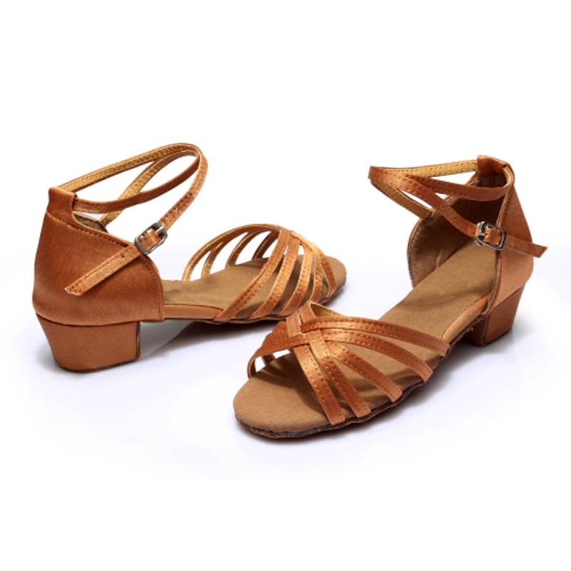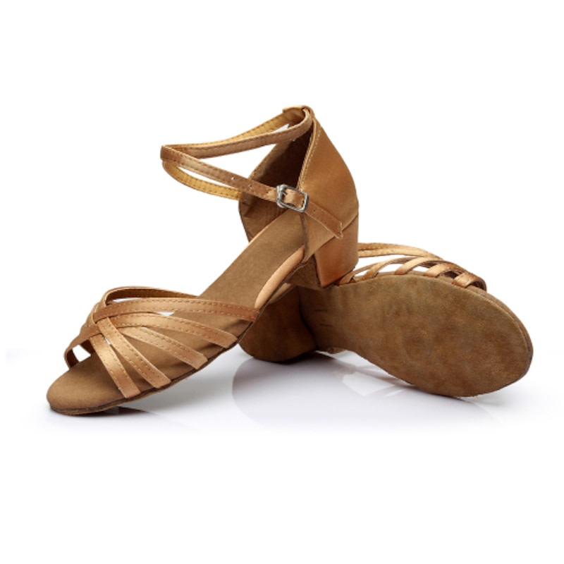 Highlights [Fabric] : Crafted with satin for a luxurious look and smooth finish, these women's dance shoes are complemented by synthetic lining for added durability. The suede outsole ensures excellent traction on the dance floor. [Style & Fit] : Featuring a chic sandal style, these shoes have an open-toe design and a thick, low heel at 1.38 inches (3.5 cm), providing stability without compromising on elegance. They offer a secure fit with a buckle closure, ensuring comfort during prolonged use. [Design Highlights] : The shoes boast a strappy design that enhances breathability and style, complete with an adjustable ankle strap for personalized support. Available in a variety of colors, including leopard print, nude, black, silver, brown, and gold, these shoes are perfect for versatile outfit pairing. [Occasions] : Ideal for indoor practice and professional performances, these Latin dance shoes are perfect for ballroom and salsa dancing, as well as line dance practices. Their fashionable yet functional design makes them suitable for formal occasions, ensuring you look graceful and feel comfortable. [Size Range] : Offering a wide range of sizes from US3.5 / EU33 / UK1.5 to US9 / EU40 / UK7, these shoes are designed to fit a broad spectrum of foot sizes, ensuring women and kids find their perfect fit. Perfect for everyday use. supreme materials and excellent craftsmanship ensure long-lasting durability.