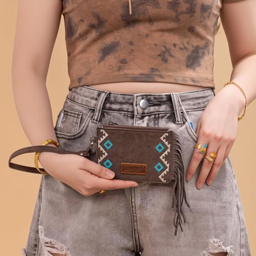 This fringe card wallet for women with 2 Rfid-block card slots, 1 ID window, 1 long slot and 1 side zipper pocket for the coins or cash. Compact size fits essentials without bulk, ideal as a slim wallet every dayWomens slim wallet measuring 5.2 (L) x 0.3 (W) x 3.3 (H) inches and weighing just 0.21 lbs. With a detachable wristlet strapβ design, you can easily carry a small wallet in hand or put it in a bagThis slim womens wallet blends aztec and western styles with fringe details and earthy ranch-inspired tones for a free-spirited vibe. ideal for music festivals, western clubs or casual outingsWestern small rfid wallet for women made with safeguard credit cards and IDs from digital theft with built-in RFID shielding, ensuring peace of mind during travel or crowded eventsWomens wallet is a crowd-pleaser for Western-themed events, Music Festival or birthdays. Its eye-catching design and premium craftsmanship make it feel luxurious yet approachable, while the dustproof packaging adds a thoughtful touch Perfect for everyday use. supreme materials and excellent craftsmanship ensure long-lasting durability.