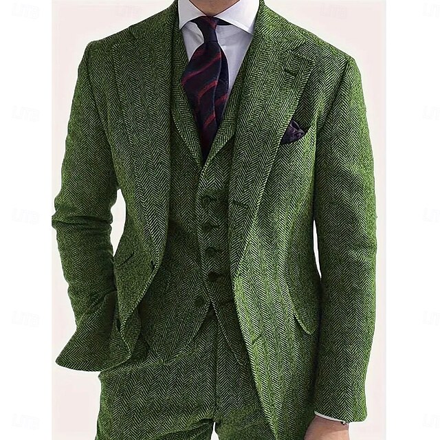 More information about Men's Wedding Business Tweed Suits Notch Lapel Green Formal Herringbone Tailored Fit 3 Piece Single Breasted One-button