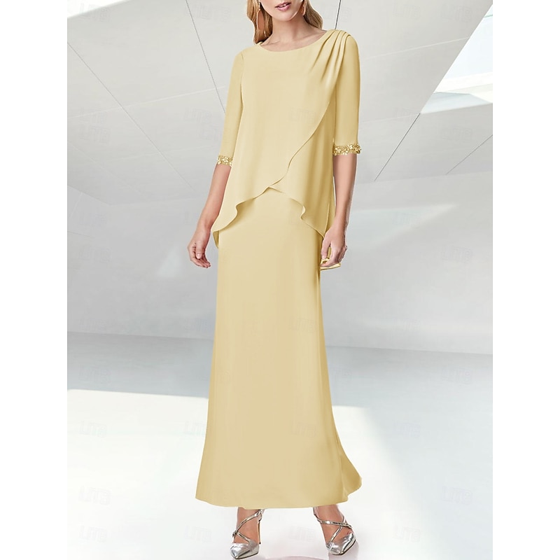 Highlights [Title] : TS Sheath Mother of the Bride Dress: Elegant Jewel Neck Floor-Length Chiffon with Sequin Ruching [Fabric] : Crafted from high-quality chiffon, this dress offers a luxurious feel and an elegant drape that enhances its sophisticated appearance. The delicate ruching and sequin embellishments add a subtle sparkle, perfect for capturing attention. [Fit] : Designed in a sheath silhouette, this dress gracefully contours the body, providing a flattering and sleek fit. The built-in bra and half sleeves offer added support and comfort, ensuring you feel both charming and secure. [Design Highlights] : Featuring a refined jewel neckline and a modern asymmetrical layered top, this dress is a blend of classic elegance and contemporary style. The subtle embellishments at the cuffs add a hint of sparkle, enhancing its overall allure. [Occasions] : Ideal for weddings, evening gatherings, and formal events, this dress exudes sophistication and charm, making it a perfect choice for a mother of the bride or any formal occasion. [Size Information] : Available in a range of sizes from US 0 to US 26W, including custom measurements to ensure the perfect fit for every individual. This dress ensures elegance and style for every woman, fitting a wide array of body types seamlessly. Perfect for everyday use. first-class materials and excellent craftsmanship ensure long-lasting durability.