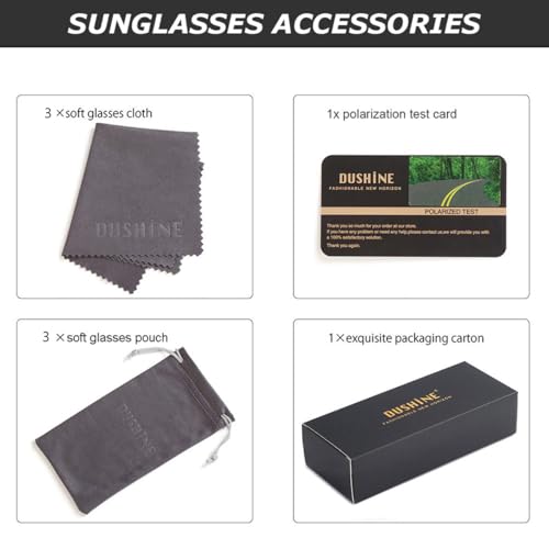 Care instructions: Avoid exposure to high heat. Store in a protective case when not in use. Clean lenses with a microfiber cloth.Origin: ImportedHD Polarized Lens – Offering UV 400 Protection.Restore true color,eliminate reflected light and scattered light,cut glare and protect eyes perfectlyHigh Quality Materials – These Dushine sunglasses are made of high-quality plastic frames,UV400 polarized lenses,reinforced metal hinges,all the details ensuring you a long time usingPackage Contents and Dimensions: Classic Polarized Sunglasses*3, Eyewear Pouch*3, Eyewear Cloth*3, Packing Box*1 :The sunglasses dimension is:lens width: 50mm(1.96inches).lens height: 49mm(1.92inches) .temple length: 136mm(5.35inches) and nose bridge: 20mm(0.78inches).sophisticated and unique design - These DUSHINE sunglasses help reduce glare and provide additional clarity . perfect for outdoor sports and activities such as shopping, driving, walking, traveling, etc., and are suitable as a high fashion accessory and daily wear throughout the year.Customer Service – Any questions about our products,please contact us.We will provide the best service until our customers are satisfied Perfect for everyday use. finest materials and excellent craftsmanship ensure long-lasting durability.