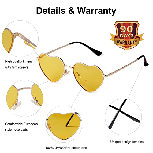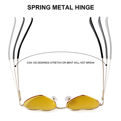 Origin: Imported【EYES PROTECTION & NATURAL SIGHT】The retro heart sunglasses metal frame with HD POLARIZED LENSES and UV400 RATED TECH, can effectively reduce glare reflected of roads, bodies of water, snow, and other horizontal surfaces, and restore the true color, also block 100% harmful UVA/UVB RAYS and protect your eyes against long-term UV damage.【HEART STYLE DESIGN】These yellow heart shaped sunglasses use the new metal spring hinges to make sunglasses could fit most face shapes.Colorful frame and mirrored reflective lenses make the integrated design cool and charming. Top soft silicone nose pads reduce pressure and maximize the wearing comfort.【DIMENSIONS– DIMENSION】: Lens Width: 53mm(2.08inches) | Lens Height: 43mm(1.69inches) | Temple Length: 136mm(5.35inches) | Nose Bridge: 19mm(0.74inches)【WIDELY USED】: These heart shaped yellow tinted sunglasses are always in trend and use sharing is everywhere. With exceptional quality, performance and comfort, these womens mens polarized sunglasses are great for daily and outdoor activities use,like driving, travling vacation or used as party, cosplay costume accessories.【first-class MATERIAL AND SERVICES】: These Yellow Sunglasses womens Light Weight and Flat, Durable Shatterproof, long wear does not press nose give you a unique and comfortable wearing experience. In case of any broken issues, please contact us without hesitation. we will provide the best service until our customers are satisfied. Perfect for everyday use. High quality materials and excellent craftsmanship ensure long-lasting durability.