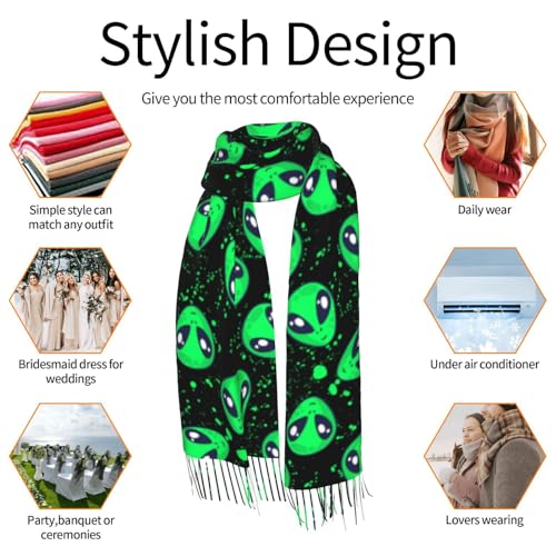 Fabric type: 100% PolyesterCare instructions: Hand WashOrigin: Imported**Luxurious Softness:** Our scarf for women is made from ultra-soft faux cashmere, providing a plush, skin-friendly feel. This winter scarf for women is perfect for staying cozy during cold weather, making it a must-have accessory.**Stylish & Versatile Design:** This cute green alien Print shawl wrap for women features a unique and fashionable design, draping beautifully over your shoulders. Whether paired with a coat, sweater, or suit, this fall scarf for women adds a touch of elegance to any outfit.**Conveniently Portable:** Measuring 77 inches by 27 inches, this large scarf can be easily rolled up and stored in your bag, making it an ideal travel scarf. Its lightweight design ensure that you can carry warmth and style wherever you go.**Perfect for Every Occasion:** Whether you're looking for a chunky scarf to wear during winter outings or a wool scarf to complement your daily look, this women's fashion scarf is versatile enough for any occasion. Itβs an excellent winter accessory for women, enhancing both comfort and style.**Thoughtful Present Choice:** This oversized scarf, with its unique patterns and colors, makes a perfect present for friends and loved ones. Ideal for birthdays, holidays, or just because, itβs a thoughtful way to show you care. Perfect as a blanket scarf, it's suitable for spring, autumn, and winter. Perfect for everyday use. supreme materials and excellent craftsmanship ensure long-lasting durability.