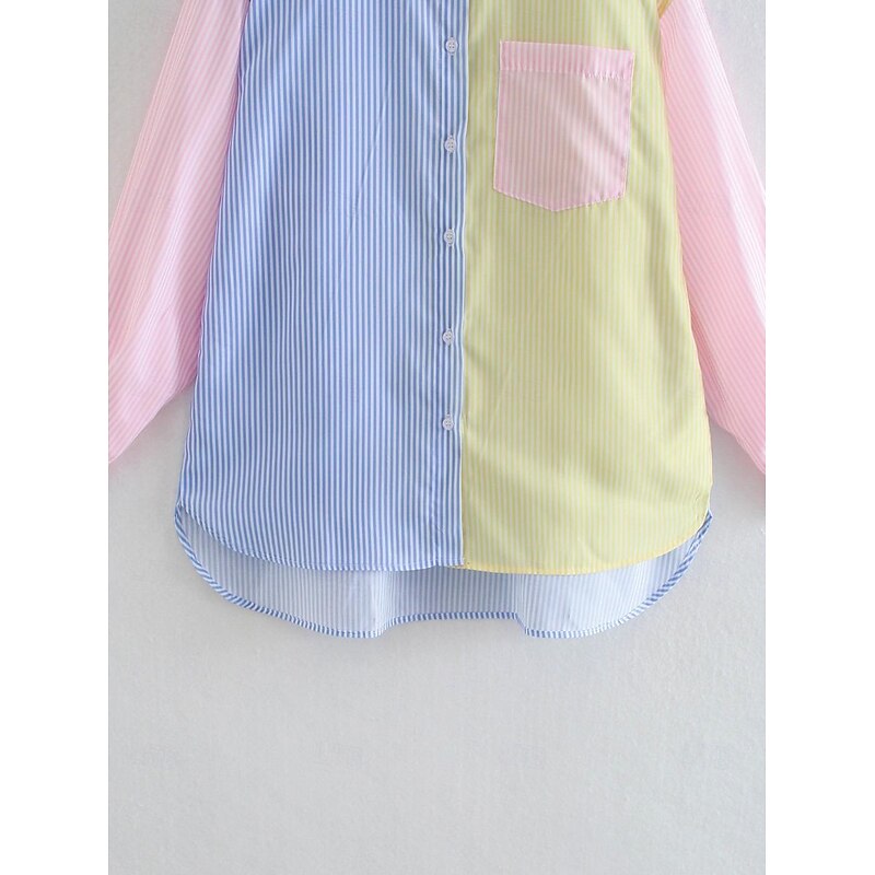 The blouse boasts a vibrant color block pattern with pastel pink, blue, and yellow stripes, paired with a button-down front for a playful, modern twist. A large front pocket in contrasting stripes enhances its casual chic appeal, while a classic shirt collar adds a touch of elegance.