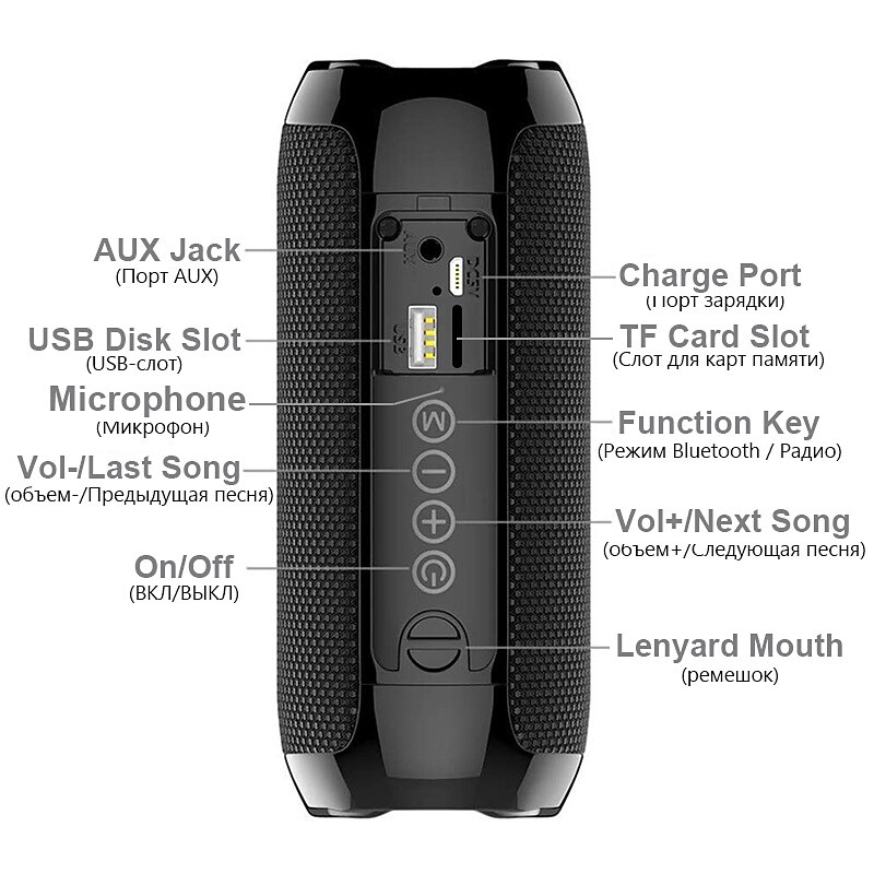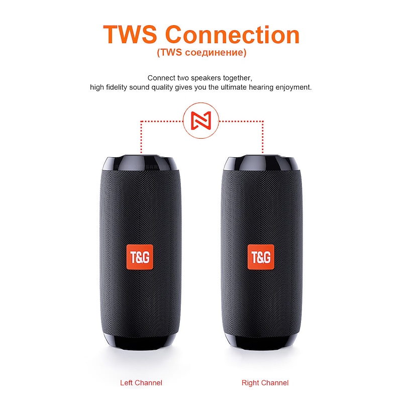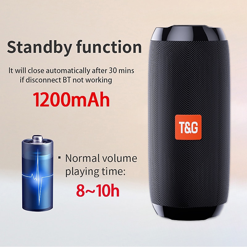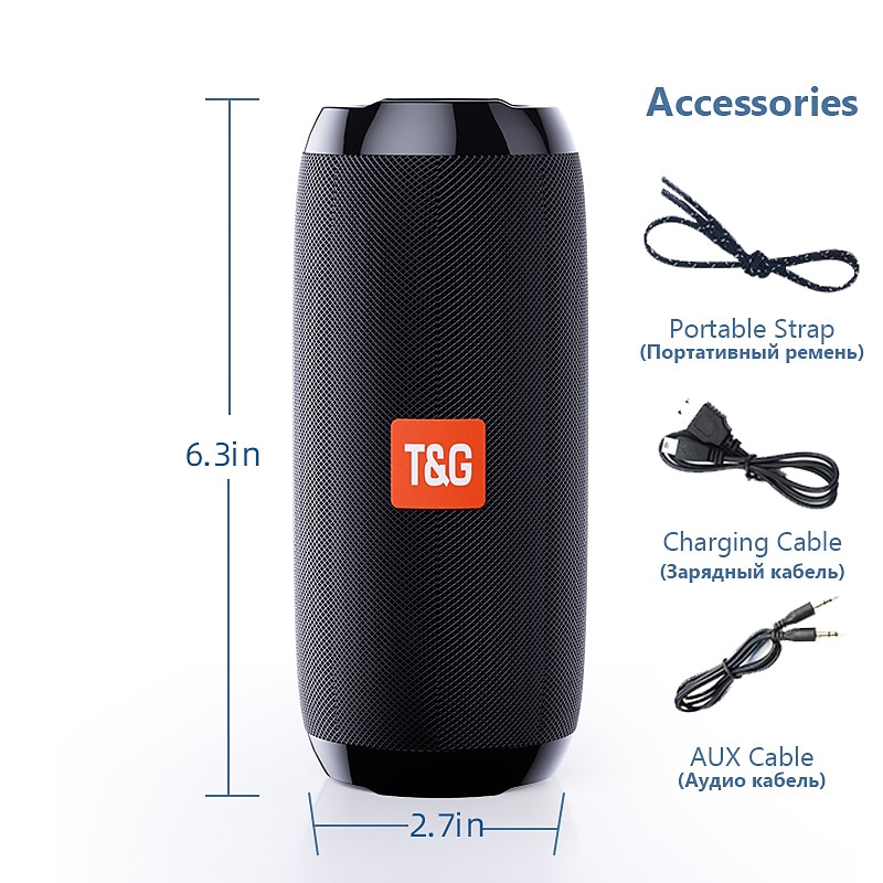 Highlights Product Selling Points: 1. Brand new and first-class with durable ABS material. 2. Mesh cover protects the speaker from water, dust, and shock. 3. IPX5 waterproof, dustproof, and shockproof for outdoor use. 4. Powerful 5W*2 speakers with dual bass diaphragms on each side, providing a vibrating music experience. 5. exceptional cylindrical shape and built-in left and right channel offer a 360° stereo sound experience. 6. Convenient call function with a noise-canceling microphone for hands-free phone calls. 7. Built-in FM receiver allows you to listen to the radio anytime, anywhere. 8. Wide compatibility with support for MP3, WMA, WAV, FLAC, and APE music formats. 9. Supports TF Card or micro SD Card up to 32G, as well as USB 2.0 Disk. 10. Plug and play with USB flash disk for easy music playback. 11. Supports external MP3/MP4/computer and other audio input functions (AUX). 12. Easy control with button features including power on/off, play/pause, mode switching, song skipping, and volume adjustment. 13. Bluetooth 5.0 technology provides fast and stable connections with all Bluetooth devices. 14. Long-lasting 1200 mAh battery provides up to 10 hours of playtime at 2/3 volume on a full charge. 15. TWS function for immersive 360° stereo sound and 3D stereo surround sound experience. 16. Multi-functional device serving as a Bluetooth speaker, radio, wired speaker, and bass boom box. Specification: - Bluetooth version: 5.0 - Bluetooth distance: Up to 33ft - Supports FM, Micro SD card/TF card input, U disk input, 3.5mm audio input - Extended memory: Supports up to 32GB (not included) - Battery capacity: 1200mAh - Charging Time: 2-3 hours - Listening/Talking time: 6-8 hours - Waterproof level: IPX5 - Charging parameters: 5V - Supports music formats: MP3, wav, wma, FLAC, APE - Frequency response: 120Hz-20KHz - Signal to noise ratio: ≥90dB - Distortion rate: Less than 0.5% - Material: ABS, mesh Perfect for everyday use. High quality materials and excellent craftsmanship ensure long-lasting durability.