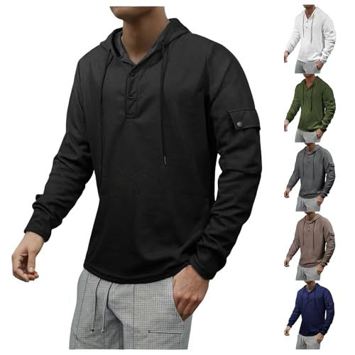 Men's Quarter Button Waffle Knit Hoodie Oversized Long Sleeve Drawstring Pullover Comfort Fit Top