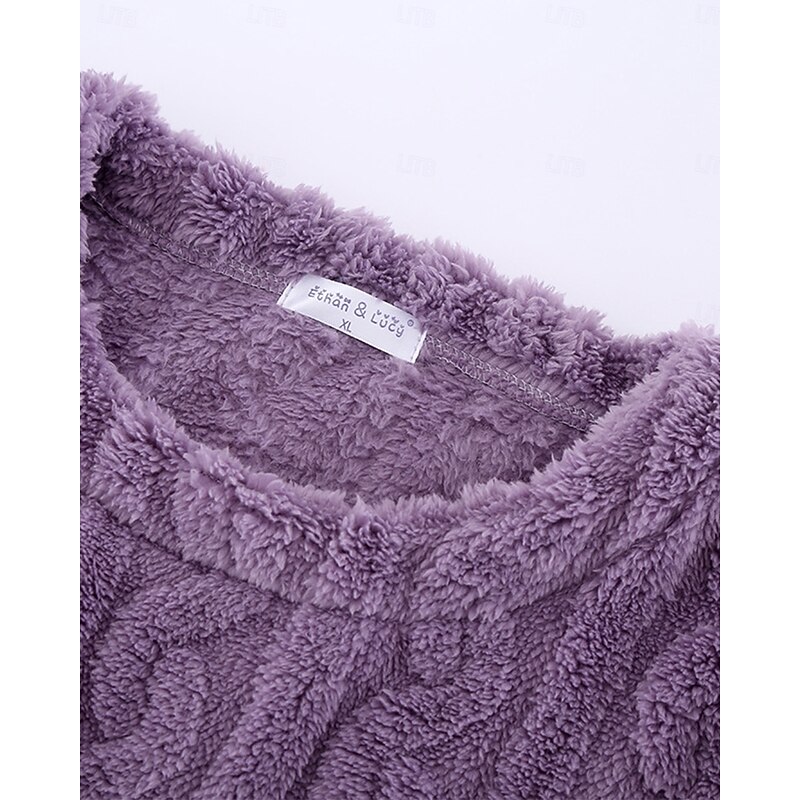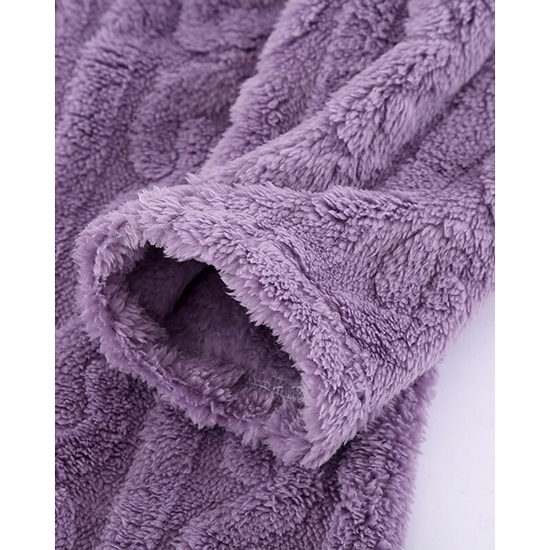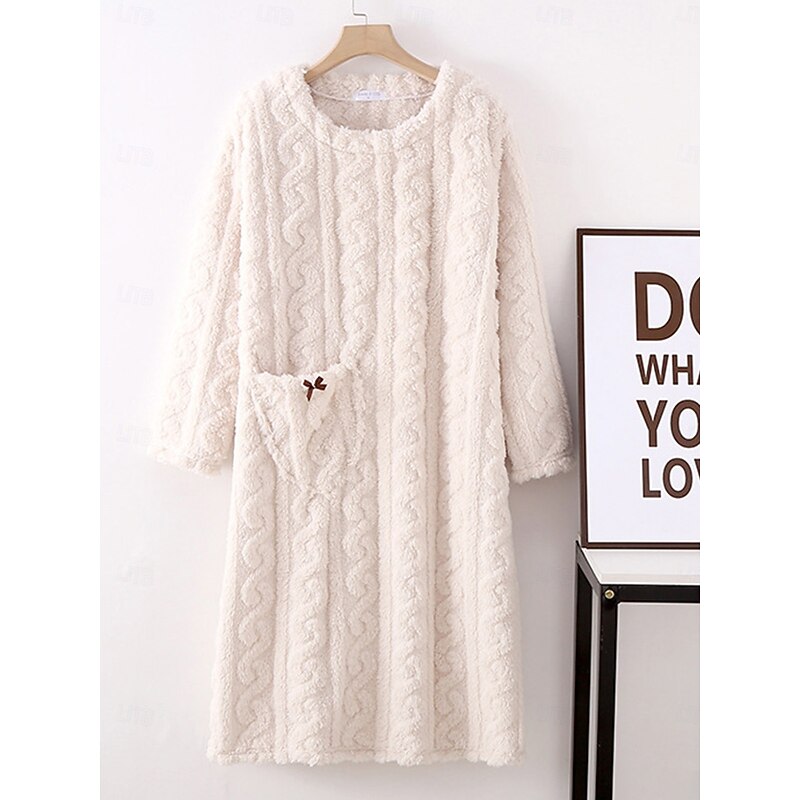 Highlights [Fabric] : Crafted from plush, high-quality fleece, this women's nightgown provides exceptional warmth and comfort, making it the perfect choice for cooler spring and fall evenings. The stretchy material ensures a snug yet flexible fit, embracing you in cozy softness. [Fit] : With its relaxed fit, this nightgown is designed for comfort. The long sleeves and crew neck enhance its cozy appeal, providing ample coverage for a restful night's sleep or a comfortable day at home. [Design Highlights] : Featuring a charming cable-knit pattern throughout, this nightgown exudes a subtle style. The addition of a practical front pocket, finished with a delicate bow, introduces a cute and functional element, while the soft lavender color adds a calming and soothing vibe. [Occasions] : Ideal for home wear, this nightgown suits a variety of occasions, from relaxing evenings to peaceful mornings. Its simple and comforting style makes it a versatile addition to any home outfit collection, ensuring you stay cozy and sophisticated. [Size] : Available in M, L, and XL, this nightgown caters to a range of body types, ensuring everyone can enjoy its luxurious comfort. Choose your size for the perfect fit and wrap yourself in warmth and style. Perfect for everyday use. finest materials and excellent craftsmanship ensure long-lasting durability.