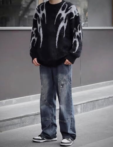 Yimoon Mens Oversized Sweaters Y2K Aesthetic Flame Graphic Crewneck Knitted Casual Pullover Long Sleeve Jumpers