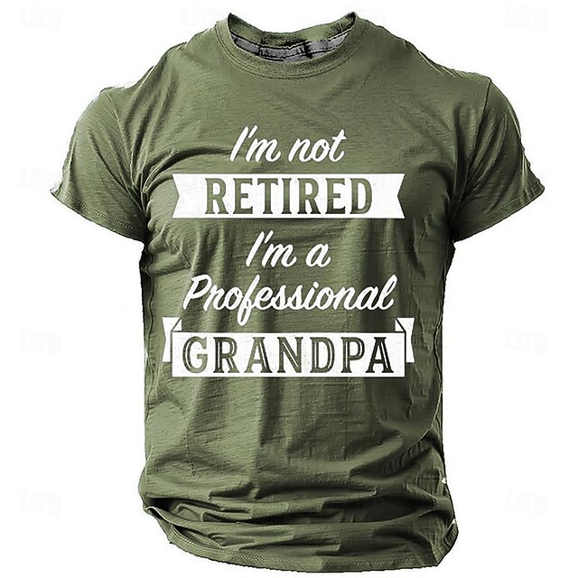 : Featuring a bold, humorous quote "I'm not retired, I'm a professional grandpa" in striking white typography, this T-shirt adds a playful touch to any outfit. The 3D print enhances the visual appeal, while the olive green color provides an earthy tone that balances style and humor.