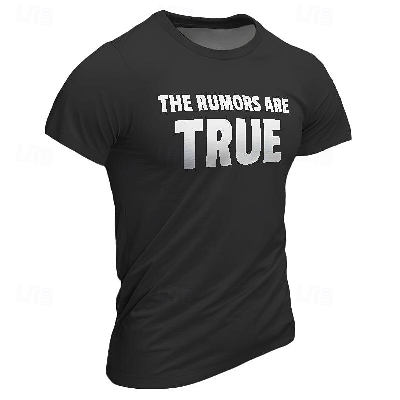 : Featuring a bold and eye-catching 3D graphic letter print, the t-shirt proudly displays the statement "THE RUMORS ARE TRUE" across the chest. Its rich black, navy blue, and purple tones, along with a retro vintage style, make it a standout choice for any wardrobe.