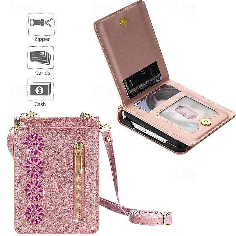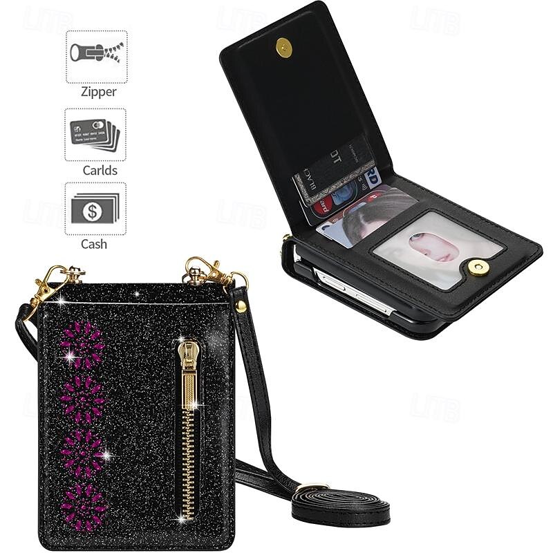 More information about Phone Case For Samsung Galaxy Z Flip 7 Z Flip 6 Z Flip 5 Z Flip 4 Z Flip 3 Flip Cover Zipper with Lanyard Bling Glitter Shiny Retro PC PU Leather