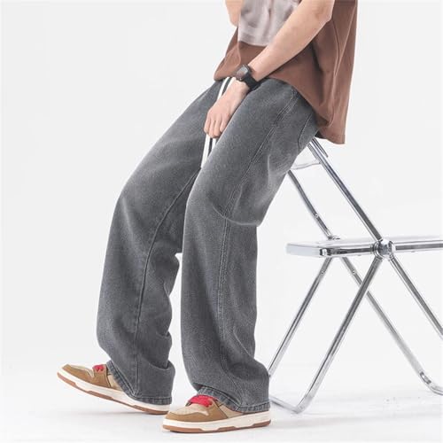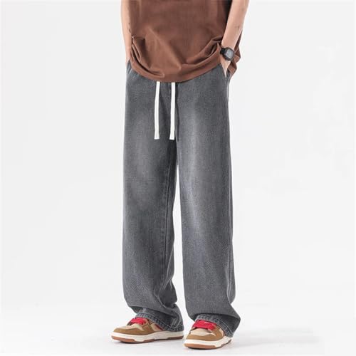 Men Straight Jeans Elastic Waist Drawstring Wide Leg Pants Vintage Casual Trousers