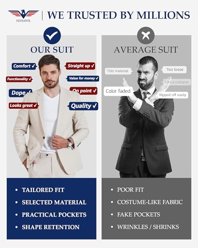 Fabric type: Linen Textured Fabric (29.2% linen, 28.2% polyester, 25.5% viscose, 16.5% cotton)Care instructions: Dry Clean OnlyOrigin: ImportedHiHawk - High Class, Hawk Style: The Hihawk two-piece suit features a classic notch lapel and a single-breasted one-button closure for an elegant look. Functional pockets include flap pockets at the waist, a chest welt pocket, and trousers with slant and buttoned welt pockets. The black buttons are secure and add a refined touch, enhancing the suit's durability and style. and refined finishing complete the polished appearance.Why Choose Linen Fabric? Linen fabric offers exceptional breathability, keeping you cool in warm weather. Its natural moisture-wicking properties help absorb sweat, ensuring comfort. Linen is highly durable, with strong fibers that withstand wear and tear. The fabric's unique texture adds a sophisticated, relaxed look to this suit.Versatile Suiting: This suit is perfect for a variety of occasions. Its lightweight and breathable nature makes it ideal for summer weddings, outdoor events, and beach parties. The relaxed yet sophisticated look is suitable for casual business meetings, garden parties, and weekend get-togethers. It also works well for travel, providing comfort and style in warm climates. Versatile and stylish, it's a great choice for any event where you want to look sharp and stay cool.Complete Suit Set with Care Instructions: This suit includes a jacket, trousers, and a complimentary tie. Upon receiving your suit, please dry clean it to prevent shrinkage. Hang the suit when not in use to avoid wrinkles. If ironing is needed, use a low heat setting.Find Your Perfect Fit: Please refer to the picture 4 and Amazon's size chart / size guide. Choose a size with a chest circ that is 4-5 inches larger than your own. For example, if your chest circ is 39, M(43) might be your size. Ensure your shoulder and waist measurements don't exceed the chosen size. If not sure, welcome to share us your height, weight, chest, and waist circ, and we'll find your closest size. Perfect for everyday use. High quality materials and excellent craftsmanship ensure long-lasting durability.