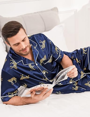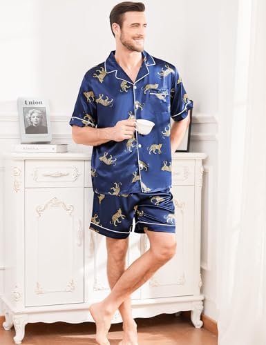 SWOMOG Men Silk Pajama Set Short Sleeve Satin PJs Sets 2 Piece Button Down Sleepwear silky Summer Loungewear with Pockets