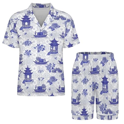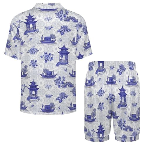 Men silky Short Sleeve Mens Pajamas Set Blue Chinoiserie Loungewear Summer Lightweight Two Piece Sleepwear Pajamas Sets